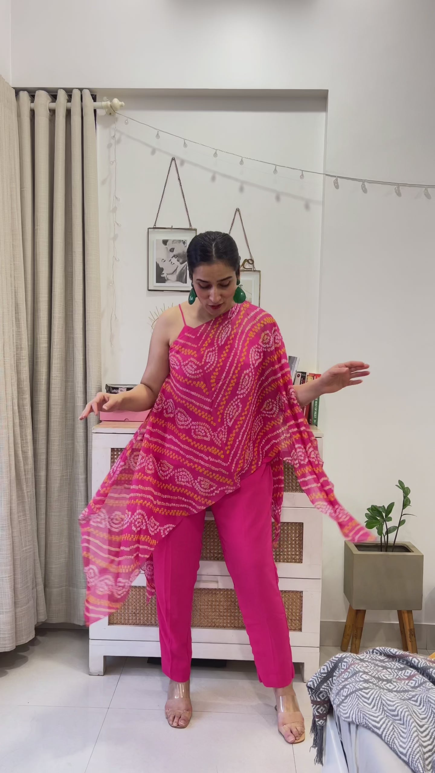 Co-ord set including a Versatile top that can be worn in 3 different ways made in pure georgette bandhej and comes with a slip and Pants.