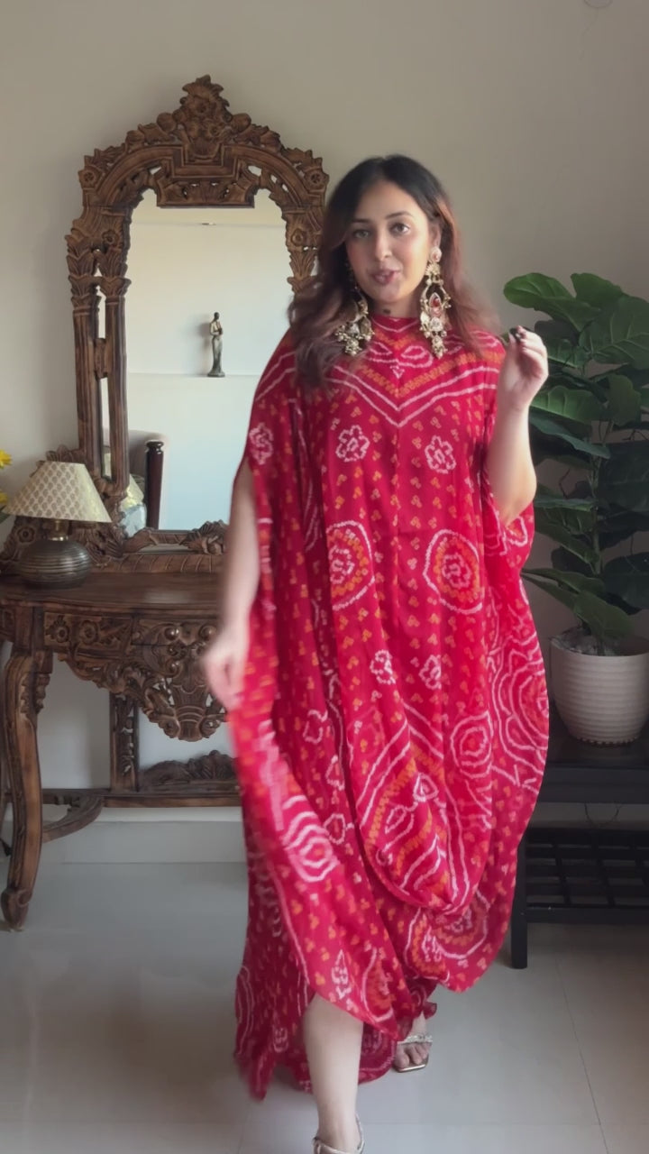 An oversized anti-fit tunic featuring elegant front cowls & tail at the back, crafted from hand-tied and dyed bandhej on pure georgette fabric. Paired with a Fitted slip for effortless styling